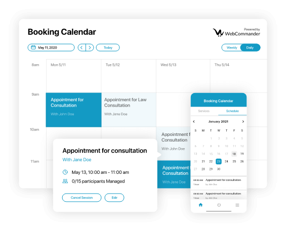 Adding an online booking or appointment scheduling system to your website is very simple with WebCommander. Just define your services, assign staff or providers, set availability and let out system automate the rest!